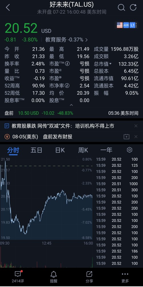 May 24, 2021 · "双减"政策即将落地,教育中概股集体下挫. Jun 08, 2021 · 中概教育股高途反弹,掌门教育涨超40%。泛欧股指三日连创新高。美元反弹,比特币盘中逼近3.1万美元创近三周新低。10年期美债收益率创一个月. Jun 16, 2021 · 投资者等待美联储货币政策会议结果,并关注其对购债计划、通胀、利率和经济前景的看法,美股集体收跌,纳指从前日新高回落跌逾百点;科技股及教育股下挫,老虎证券跌逾16%,优信跌近13%,诺基亚跌近10%,网易有道跌近6%。